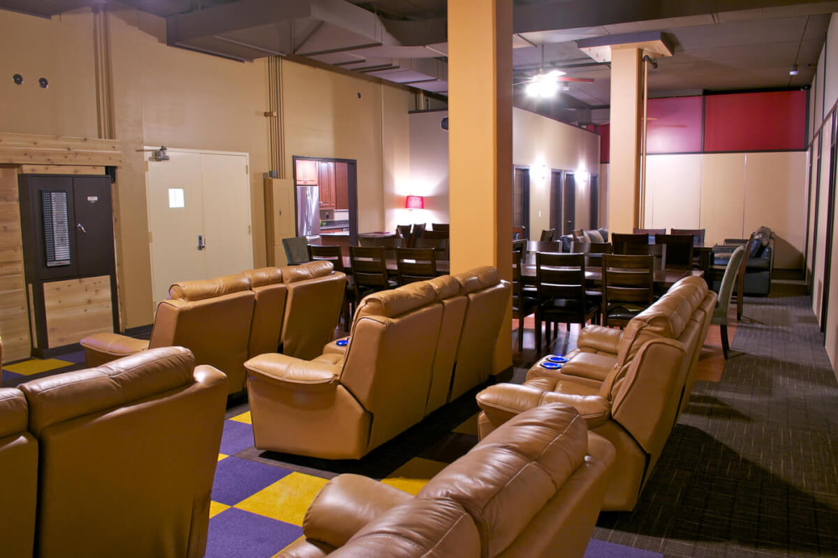 > “great room” area where people can gather during the day for meetings, relax or do their chores;
