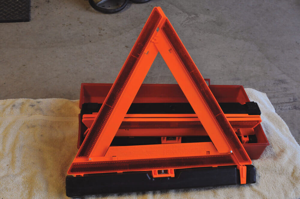 Reflective triangles. Use these to warn other drivers that your car is stuck up ahead. Place them around the nearest corner or far enough away so that drivers have time to slow down. Experienced winter drivers will expect to see your car on the same side of the road where you placed your warn markers.