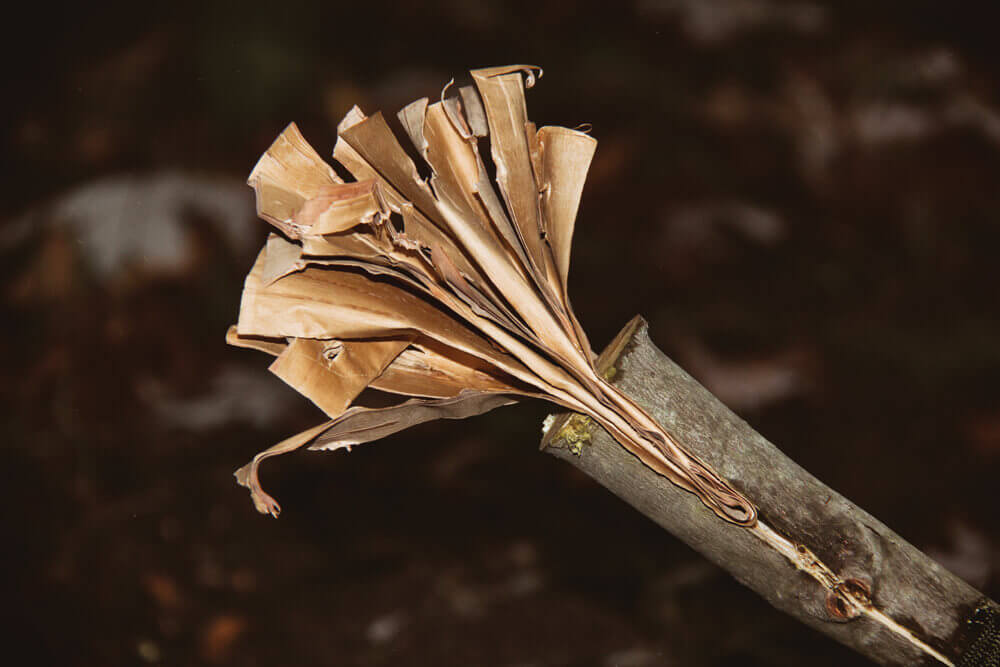 A birch bark torch is simple to make in relatively no time. Use a sharp knife and remove thick layers of bark down to the inner bark of the tree. Take the strip of birch bark and create 1- to 2-inch folds—similar to an accordion shape. Cut a green wood handle to size and split it down the middle at one end. This split will accommodate the folded birch that will ultimately be lit, thereby creating the torch.