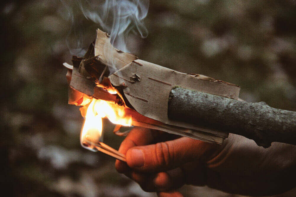 Birch bark can be used for quick torches such as this one, and its oil can be extracted for use as lamp fuel or lubricating grease. You can easily extract birch oil by building a fire over two cans buried in the ground.